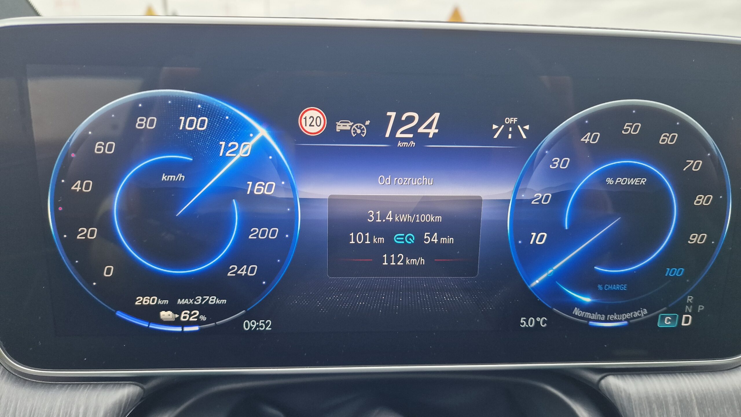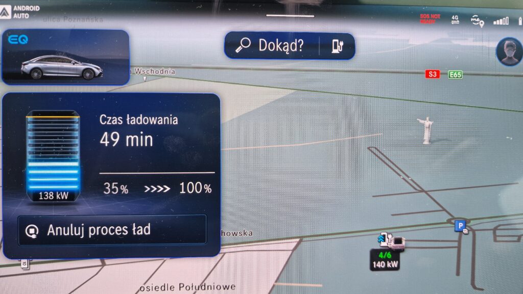 Podróż takim pojazdem, także jest przyjemna. Samochód jest cichy, inny sens ma dobrej jakości zamontowany sprzęt audio, oczywiście tutaj napotykamy pierwszy podnoszony problem elektromobilności, zasięg podróży. Zależy on od baterii zamontowanej w pojeździe, stylu jazdy, w dużej mierze także od pogody. Wskazanie zasięgu jako problemu jest mylne, problemem jest nierozwinięta infrastruktura ładowania, no i czas jaki trzeb spędzić ładując wóz. Nie ukrywam, taki stan rzeczy dość waży, jednak jak się sam przekonałem, wcale nie tak mocno jak przeciwnicy elektro to pompują. Zimą jest zasadniczo mniejszy zasięg – TAK, im szybciej jedziesz, zasięg szybko maleje – TAK, ładowarek jest za mało – tu się nie zgodzę, oczywiście zawsze może być więcej, ale na ten moment jest w mojej ocenie wystarczająco. Samochód sam zaplanuje trasę, automatycznie podgrzeje baterię przed ładowaniem, a samo ładowanie na szybkiej ładowarce to najczęściej 30 minut. To idelny czas na przerwę, kawę czy inne technikalia podróży 😊. Różnica czasu na ładowanie na trasie 500 km w porównaniu do spalinówki to około 20-30 minut. Dla mnie akceptowalne.