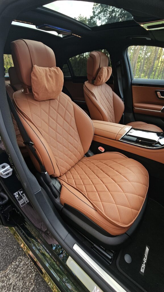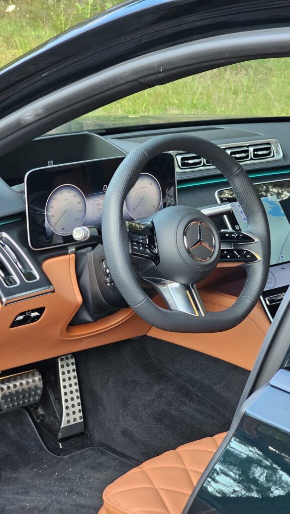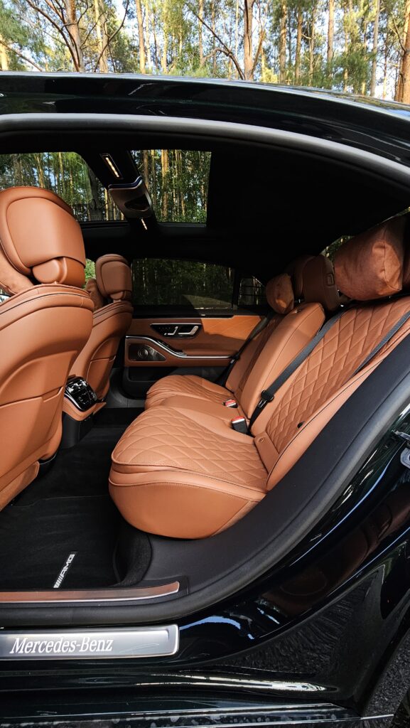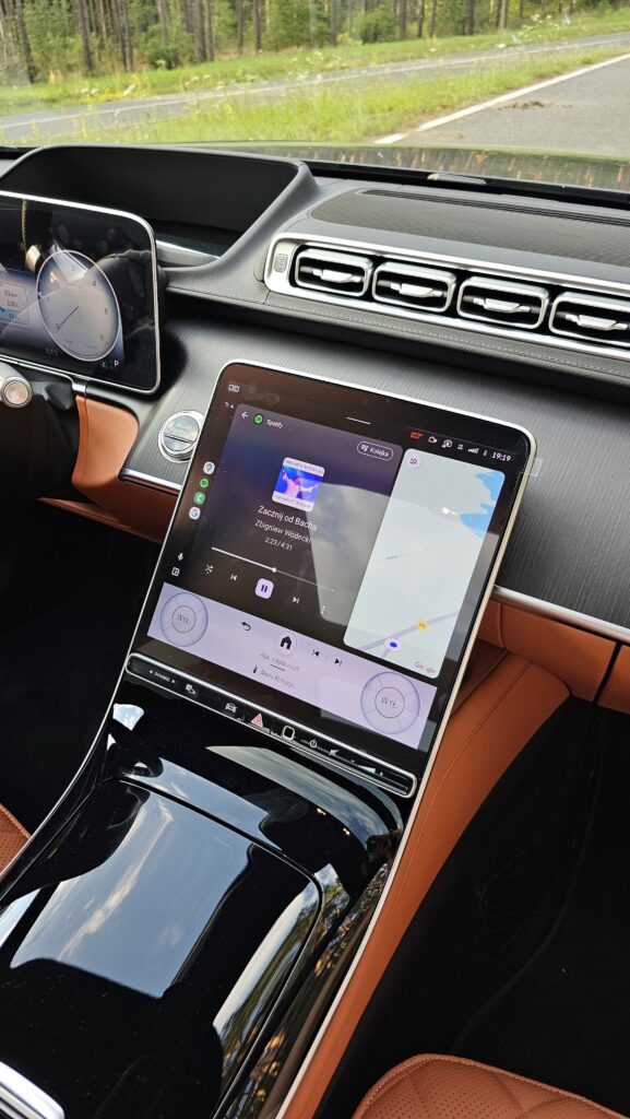 Wyposażenie stoi na poziomie, który trudno zakwestionować: pneumatyczne zawieszenie z regulacją tłumienia, pakiet asystentów, system MBUX z dużym ekranem. Wersja testowa miała fotele z masażem, wentylacją i system audio Burmester — detale tworzą tu prawdziwy komfort a audio zamienia kabinę w salę koncertową. Jak dodamy do tego specjalne szyby, które wyciszają nam kabinę, to obcowanie z tym wozem naprawdę zamienia jazdę w dużą przyjemność, gdzie pośpiech otaczającego nas świata znika za zamkniętymi z automatycznym dociąganiem drzwiami.